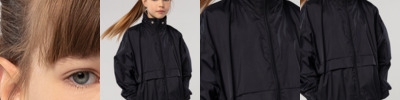 100% polyamide 210T nylon shell. This item runs small in comparison to some other brands. Please check sizing before decoration. Unlined. Shower resistant and windproof. Concealed hood. Full length zip. Underarm ventilation eyelets. Two front zip pockets. Elasticated cuffs. Drawcord at hem. Packs/zips into front right pocket.