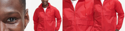 210T nylon shell. Unlined. Shower resistant and windproof. Concealed hood with drawcord. Full length zip. Underarm ventilation eyelets. Two front zip pockets. Elasticated cuffs. Drawcord hem. Packs/zips into front right pocket.