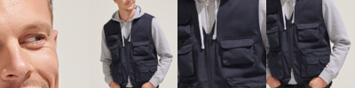 100% polyester. Pill resistant. Unlined. Covered full length zip. Right chest zip pocket. Two front zip pockets. Polyester/elastane bound collar, armholes, hem, shoulders and zips.