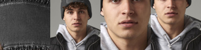 Tear-out label for ease of rebranding. Two-tone pom pom. Double-layer knit. Ribbed cuff. Cotton twill patch for printing.