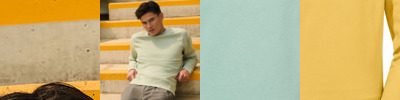 2.3cm knit collar. Shoulder to shoulder taping. Fine gauge knit. Front coverseaming on collar. Tubular construction for shape retention.