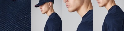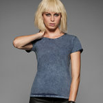 The infinite short sleeved t-shirt in single jersey in indigo dye with denim effect. Crew neck 1x1 rib collar. Set-in-sleeves. Folded cuffs with single needle topstitch. Necktape shoulder-to-shoulder, finished with double chain stitch for more elasticity. Bottom with blind stitching.