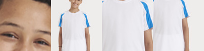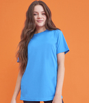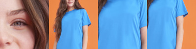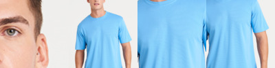 Sporty fit. Neoterictm textured fabric with inherent wickability. UPF 30+ UV protection. Self fabric bound neck and armholes. Curved back hem. Twin needle hem.