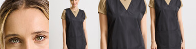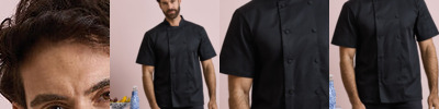 Ten button wrap over. Double pen pocket. Mandarin collar. Coolchecker® back panel.