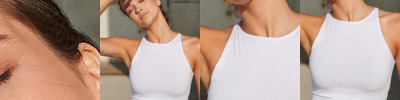 Women's cropped top with racer shape on front and back on neckline. Twin-needle stitching on hem, armholes and neckline. Cropped length. Tear-out label.
