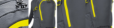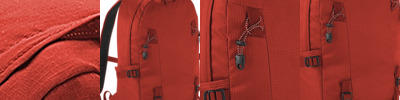 210D polyester box check dobby/300D polyester. Water resistant, durable lightweight fabric. Detachable waterproof rain cover. Grab handle. Padded adjustable shoulder straps. Adjustable waist and chest straps. Low profile ventilated back panel. Hydration bladder compatible. Trekking pole attachment points. Main zip compartment. Front zip pocket. Internal valuables zip pocket. Elasticated mesh side pockets. Key hook. Reflective accents. Tear out label. Capacity 25 litres.