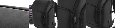 Jacquard nylon/PU coated polyester. Slash resistant body. Lightweight and durable. Padded adjustable shoulder straps. Ergonomic back panel with discrete zip pocket. Wheelie bag strap. Concealed main zip compartment. Padded iPad®/Tablet compartment. Padded laptop compartment compatible up to 15.6". Multiple internal organisation pockets. Elasticated cable organiser. Power bank pocket (power bank not included). Integrated USB charging port. Key clip. Tear out label. Capacity 15 litres.