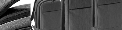 Jacquard nylon/PU coated polyester. Padded adjustable shoulder straps. Adjustable chest strap. Wheelie bag strap. Ergonomic back panel with discrete zip pocket. Large main zip compartment. Padded iPad®/Tablet compartment. Internal valuables zip pocket. External access padded laptop compartment compatible up to 17". Side zip pockets. Front organiser section. Elasticated cable organiser. Power bank pocket (power bank not included). Integrated USB charging port. Key clip. Lockable zip pullers. Tear out label. Capacity 25 litres.