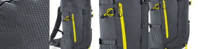 210D polyester box check dobby/300D polyester. Water resistant, durable lightweight fabric. Detachable waterproof rain cover. Grab handle. Padded adjustable shoulder straps. Adjustable waist and chest straps. Compression straps. Low profile ventilated back panel. Lightweight peripheral frame. Hydration bladder compatible. Trekking pole attachment points. Internal slip pocket. Elasticated mesh side pockets. Reflective accents. EasyPanel™ embroidery access. Tear out label. Capacity 35 litres.