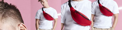Adjustable webbing belt with secure clip fastener, large zippered main pocket, zippered rear pocket.