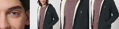 Unisex sherpa lined zip-through hoodie sweatshirt. Set-in sleeve. Lined hood in recycled sherpa. Round drawcords in matching body colour with metal tipping. Metal eyelets. Inside herringbone back neck tape in greige colour. Self-fabric half-moon at back neck. Covered metal zip at centre front. 1x1 rib at sleeve hem and bottom hem. Armhole, sleeve hem and bottom hem with twin-needle topstitch. Kangaroo pocket at front. Fully lined with recycled sherpa inside chest pocket. Inside invisible zip at bottom hem for easy decoration.