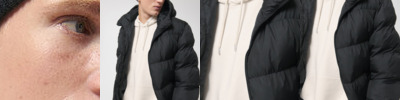 Oversized puffer jacket. Set-in sleeve. 1x1 rib at sleeve cuff. Elastic bottom hem. Lined hood with adjustable plastic stoppers and elastic cords on inside. Nylon zip at centre front with chin guard. Zipped welt pockets with extra grosgrain tape. Self-fabric half-moon at back neck. Inside zipped chest pocket. Grosgrain straps on inside for versatile and hands-free carrying. Inside zip opening at bottom hem and wearer’s left chest for easy decoration.