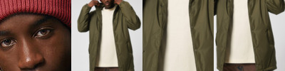 Unisex padded parka jacket. Set-in sleeve. Metal snaps at centre front. Welt pockets at front. Round drawcords at bottom hem. Semi-elastic sleeve cuff. Double layered hood with adjustable plastic stopper and elastic cord on inside. Diamond quilting on inside lining. Inside zip opening at bottom hem and wearer’s left chest for easy decoration.
