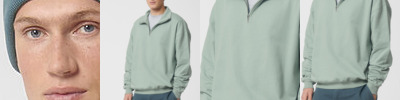 Unisex boxy dry hand feel quarter zip sweatshirt. Set-in sleeve. Neck collar in self-fabric. Herringbone tape at inside back neck and at inside of zip. Quarter zip at centre front. 2x1 rib at sleeve hem and bottom hem. Armhole, sleeve hem and bottom hem with twin-needle topstitch.