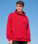 80% cotton/20% recycled polyester.* Drop shoulder style. Brushed back fleece. Double fabric hood with self colour lace drawcord. Taped neck. Front pouch pocket. 2x2 ribbed cuffs and hem. Unbranded size label at neckline.