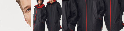 Water-resistant robe with sherpa fleece lining and a three-piece hood. Full double-ended zip down centre front. Zipped pockets with fleece lining. Inner zipped pocket with water-resistant lining. Inner embroidery access zip. Hook and loop fastening at wrist. Side vents.