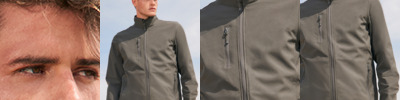 Three layer soft shell. 94% recycled polyester/6% elastane outer. Waterproof, windproof and breathable membrane. Polyester fleece inner layer. Full length zip with chin guard and inner zip guard. Right chest zip pocket. Two front zip pockets. Bound elasticated cuffs and hem. Tear out label.