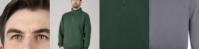 YKK zip and pull. Twin-needle stitching at arm, cuff and hem. 2x1 rib on cuff and hem. Heavier-weight fabric. Modern yet comfortable fit. Half-zip neck. Brushed inner fleece.