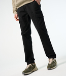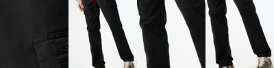 98% cotton twill/2% elastane. Modern fit. Zip fly with button over. Part elasticated waistband with belt loops. Two side pockets. Two rear welt pockets with button closure. Ticket pocket. Thigh pockets. Left leg zip pocket. Tear out label.