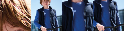 Two layer stretch soft shell. 96% polyester/4% elastane outer. Polyester fleece lining. Showerproof. Shaped fit. Collar high full length black zip. Two front zip pockets. Open hem. Curved drop hem. Tear out label.