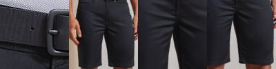 Men’s chino shorts with a touch of elastane for comfortable stretch performance. To the waistband there are loops to facilitate a belt, a metal button and a hook and bar for secure fastening. Covered YKK zip fly and side pockets with rivet detail for a typical ‘chino’ look. Two patch pockets to the reverse. Finished with a double turned hem.