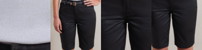 Women’s chino shorts with a touch of elastane for comfortable stretch performance. To the waistband there are loops to facilitate a belt, a metal button and a hook and bar for secure fastening. Covered YKK zip fly and side pockets with rivet detail for a typical ‘chino’ look. Two patch pockets to the reverse. Finished with a double turned hem.