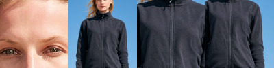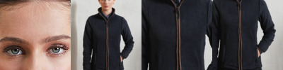 Women’s long sleeve fleece jacket with contrast trim detail. High neck rounded collar, leading into a two-way zipper. Two zipped external pockets and two internal open pockets. Stitched side panel detail. Elasticated cuff with trim detail. Contrast fabric hook on back of collar for hanging up.