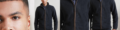 Men’s long sleeve fleece jacket with contrast trim detail. High neck rounded collar, leading into a two-way zipper. Two zipped external pockets and two internal open pockets. Stitched side panel detail. Elasticated cuff with trim detail. Contrast fabric hook on back of collar for hanging up.