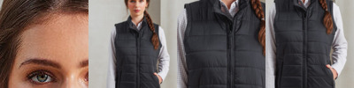Women’s padded zip-through gilet with horizontal stitching to form baffles, ensuring an even distribution of insulation. Covered zip with chin guard and zip guard to the inner. Styled with a cadet collar. Two welt jet zipped side pockets with a single open pocket to the inner for handy storage. Full embroidery access to the entire bodywarmer through an internal zip in the lining. Lightweight and folds downs easily into its own stuff sack. Made with 100% certified recycled fabrics.