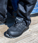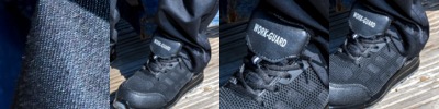 CE EN 20345:2011 SRA SB. Breathable. Durable. Lightweight. Low cut sports look. Ventilating mesh and lining wicks away moisture. Injection show moulds for this style are same for men and women; size range therefore starts with women's and runs through into men's. Padded tongue and collar. Energy absorption heel. SRA slip resistance. Spare insole set. Steel toecap. Oil resistant. Heel loop.