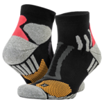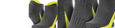 Anatomically shaped with reinforcement for optimum protection and compression. Strategic double-layer cusion impact. Pinpoint compression layers stimulate circulation. Coolmax® yarns keep cool and dry. Rib cuff. Durable knit. Trainer length. Contrast colour trim. Heel/Toe cushioning and arch support. Fast-dry.