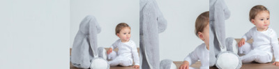 Cream coloured soft plush rabbit. Floppy ears. Contrast pink nose. Sewn eyes. Cream coloured panel on chest and feet. Zip details on the base of the Rabbit for direct access onto the tummy for embroidery. Removable inner stuffing. Complies with EN71 European Toy Safety regulations. Remove all hang tags and their fasteners before giving these items to a child. Suitable for children of all ages.