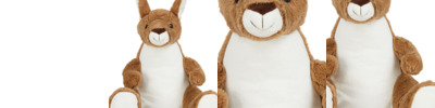 Soft plush Zippie kangaroo with contrast nose, inner ears, and feet. Sewn eyes and mouth. White panel on tummy, perfect for decoration. Zip access on base for direct access onto the tummy for decoration. Removable inner stuffing. Can be embroidered, vinyl, and sublimation printed. Complies with EN71 European Toy Safety regulations. Remove all hang tags and their fasteners before giving this item to a child. Suitable for all ages.