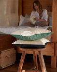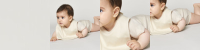 Baby bib. Double-layer interlock. Self-fabric rouleau binding at neck and outside edge. Double snap-closure size adjustment at back neck.