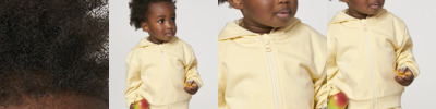 Baby zip-through sweatshirt. Set-in sleeve. Lined hood in single Jersey. Single Jersey tape at inside back neck and at inside of zip. Nylon coil-reversed zip at centre front. Two-sided zip guard at top of zip. Self-fabric half-moon at back neck. 1x1 rib at sleeve hem and bottom hem. Certified GOTS, Vegan, Fairwear, OEKO-TEX® Organic