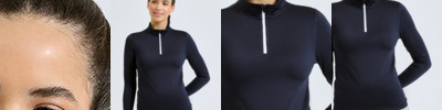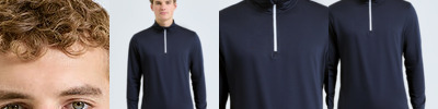 ¼ zip design. Long sleeves. Stretch. Recycled polyester. Wicking fabric. Brushed inner. The product contains no branded neck or waist label. Removable kimble or looped garment tags. The inner seam label holds important product information on one label with a second label containing brand information which can be cut-away. We recommend using block out vinyl and inks.