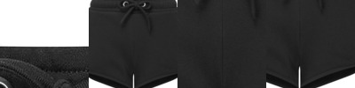 Micro shorts. Soft-stretch fabric. Self-fabric waistband. Shorts finish top of thigh. Pocket to one leg. The product contains no branded neck or waist label. Removable kimble or looped garment tags. The inner seam label holds important product information on one label with a second label containing brand information which can be cut-away. We recommend using block out vinyl and inks.