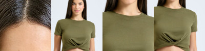 Cropped t-shirt. Short sleeve. Twist detail to front. Crew neck. The product contains no branded neck or waist label. Removable kimble or looped garment tags. The inner seam label holds important product information on one label with a second label containing brand information which can be cut-away.