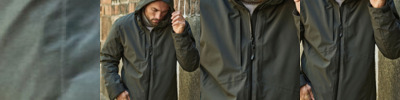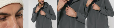 Men’s hooded softshell jacket, medium fit, with set-in sleeve and a high collar with panelled hood. Hood opening and bottom hem with adjustable plastic stopper and elastic cord. Reverse nylon zip at centre front. Zipped welt pockets with reflective elastic puller. Bonded three-layer fabric with internal membrane . Fully bonded fleece inside layer. Side panels and stretch for better shape. Adjustable hook and loop sleeve opening. Inside seams finished with recycled binding. Water-repellent up to 10,000mm, breathability up to 3000G/M2/24hrs allowing perspiration to escape. Windproof. Bionic ECO DWR (durable, water-repellent) finish.