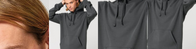 Essential unisex hoodie sweatshirt in medium fit with set-in sleeve. Self-fabric lined hood. Flat drawcords in matching body colour. Stitched buttonhole eyelets. Inside herringbone back neck tape. Self-fabric half moon at back neck.1x1 rib at sleeve hem and bottom hem. Flatlock topstitch on all seams. Kangaroo pocket with flatlock topstitch. GOTS certified, OEKO-TEX certified, Vegan certified, Fairwear.