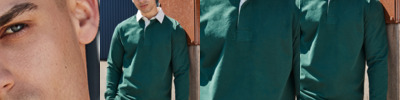 100% cotton single jersey. Heavyweight. Super soft peached finish. Slim fit. Traditional woven rugby collar with cotton webbing. Contrast trim in back neck. Zig-zag detail on underside of collar. Self colour plastic buttons with contrast stitching. Ribbed cuffs. Side vents with contrast tape detail. Twin needle hem. Tag free. For leisure use only.
