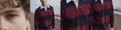 Heavyweight. Sewn stripes. Traditional woven rugby collar with cotton webbing. Rubber buttons. Taped shoulders. Taped side vents. Elastane ribbed cuffs. Twin needle hem. Tag free. For leisure use only.