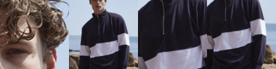 Heavyweight jersey. Self fabric funnel neck. Herringbone taped neck and side vents. Topstitching around neck armholes and panels. Metal zip and puller. Contrast stripe panel across chest and sleeves.
