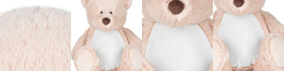 Mid Brown coloured soft plush teddy. Contrast Brown nose. Sewn eyes. Light Brown coloured panel on chest and feet. Zip details on the base of the bear for direct access onto the tummy for embroidery. Removable inner stuffing. Complies with EN71 European Toy Safety regulations. Remove all hang tags and their fasteners before giving these items to a child. Suitable for children of all ages.