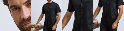 Lightweight short sleeve chef’s shirt made with certified recycled polyester. Mandarin banded collar and press stud closure. Contrast inner neckband. Two pen pockets on left arm. Welt pocket to front left chest with combined pen pocket and faux top stitching. Pocket bag can be moved to allow for embroidery. Back yoke with pleats for ease of movement through chest and shoulders. Press stud tab to the back for hanging or securing an apron in place. Reinforced side seams.