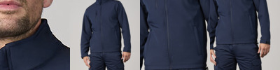Standard fit. Full-zip front. Zipped chest and side pockets. Printable three-layer binded softshell fabric. Chinguard. Internal storm flap. Adjustable shock cord hem. Windproof and showerproof.