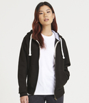 Charcoal 52% ringspun cotton/48% polyester. Soft cotton faced fabric. Brushed back fleece. Drop shoulder style. Double fabric hood with heather grey waffle lining. Chunky white flat lace drawcord. Full length brass zip covered by chunky ribbed detail. Side panels for fashion fit. Front pouch pockets. Deep ribbed cuffs and hem. Overlock stitching detail. Tear out label.
