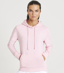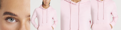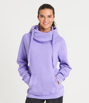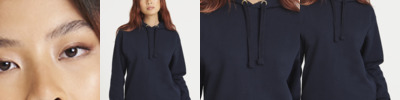 80% ringspun cotton/20% polyester.* Soft cotton faced fabric. Brushed back fleece. Drop shoulder style. Ladies fit. Double fabric hood with self colour drawcord. Front pouch pocket with ribbed edge. Ribbed cuffs and hem. Twin needle stitching. Tear out label.