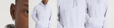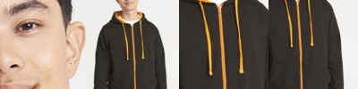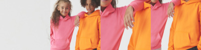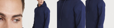 80% ringspun cotton/20% polyester.* Drop shoulder style. Brushed back fleece. Double fabric hood with contrast inner. No drawcords to comply with EU regulations. Front pouch pocket. Ribbed cuffs and hem. Twin needle stitching. Tear out label.