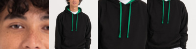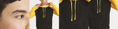 80% ringspun cotton/20% polyester.* Soft cotton faced fabric. Brushed back fleece. Drop shoulder style. Double fabric hood with contrast inner. Contrast flat lace drawcord. Front pouch pocket. Ribbed cuffs and hem. Twin needle stitching. Tear out label.